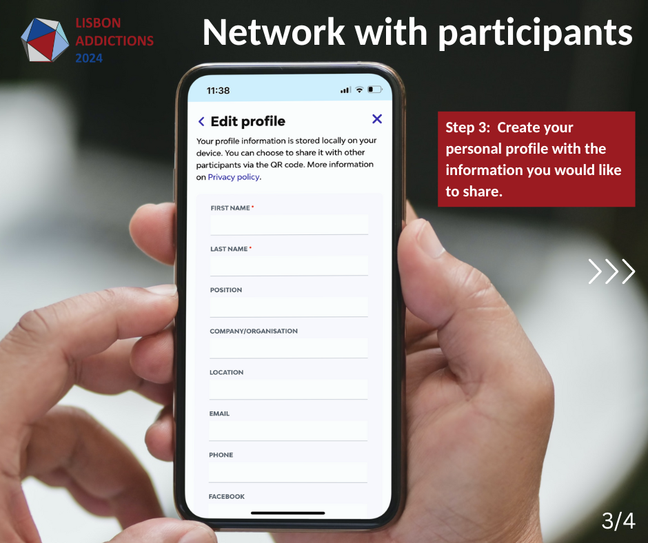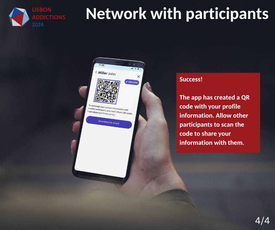 The LxAddictions app allows you to create a profile with the personal information you are happy to share, contact data and social media accounts. The app will create a personal QR code. Let other participants scan the code with their mobile device to save your contact information.